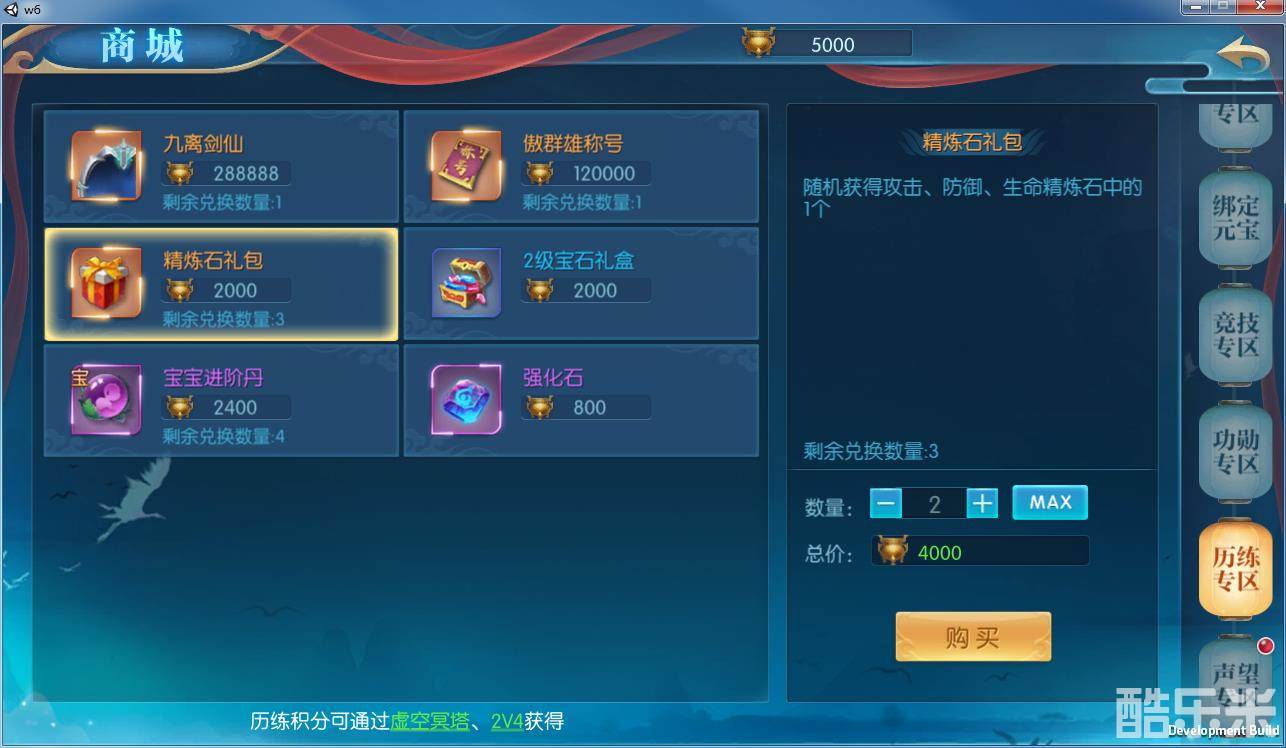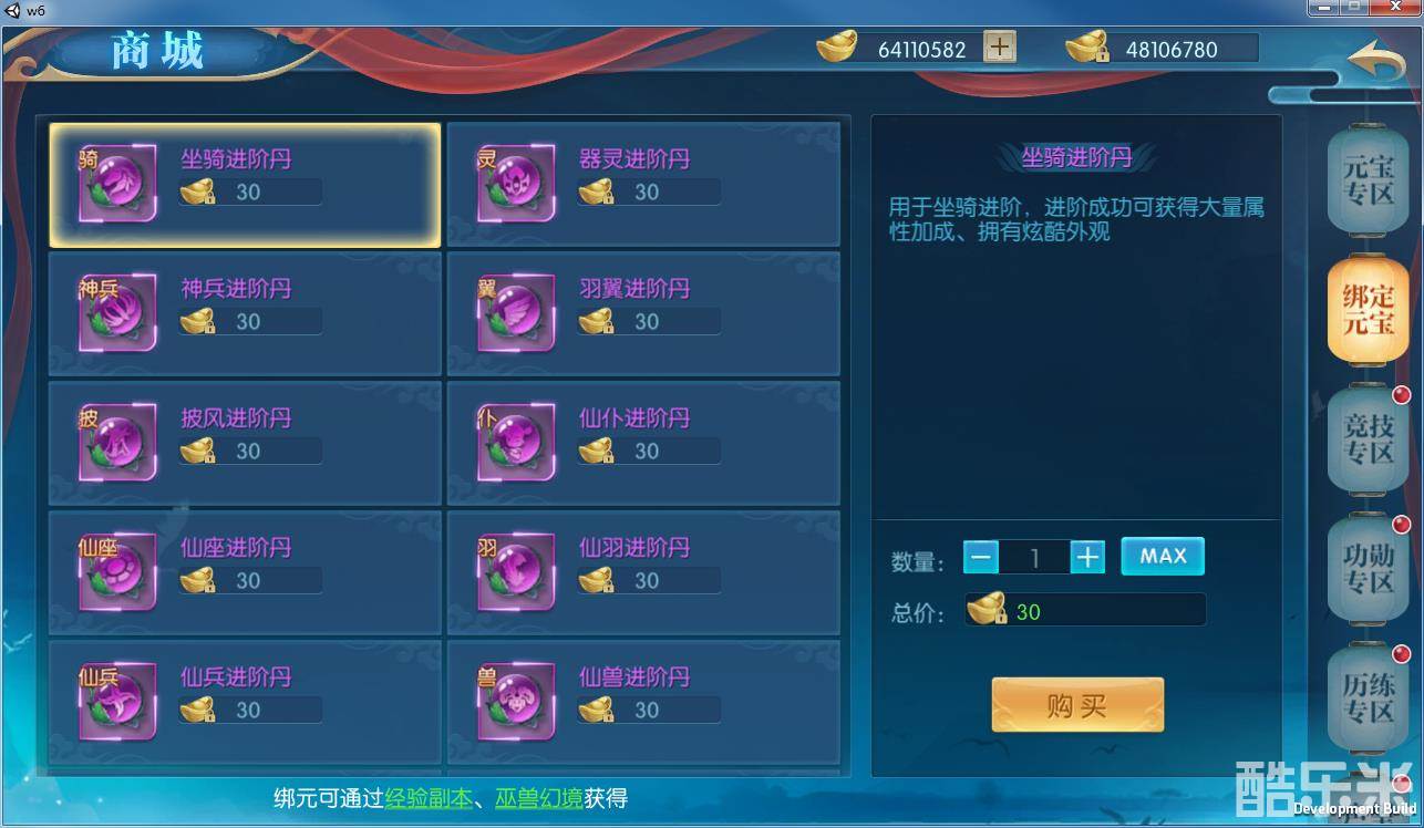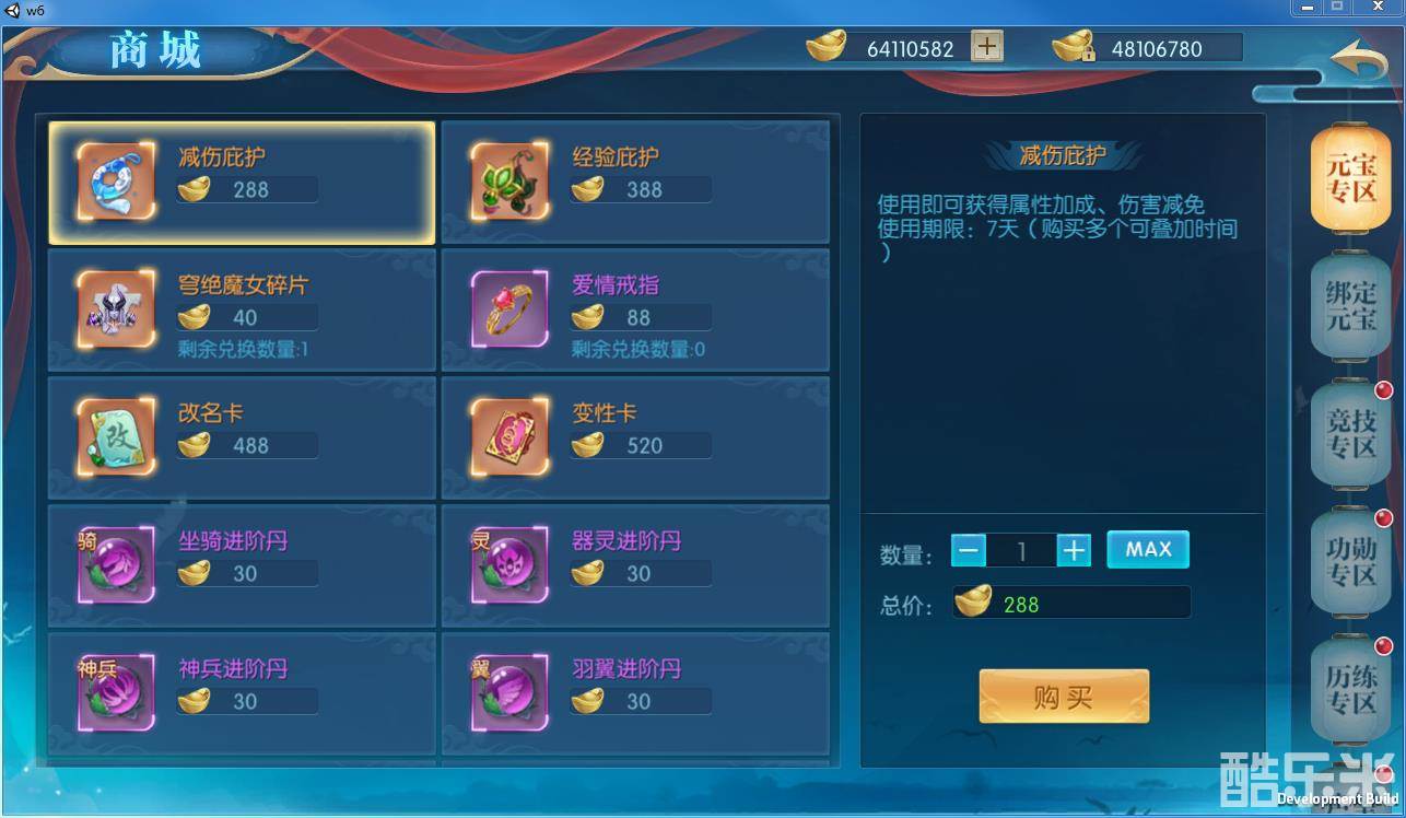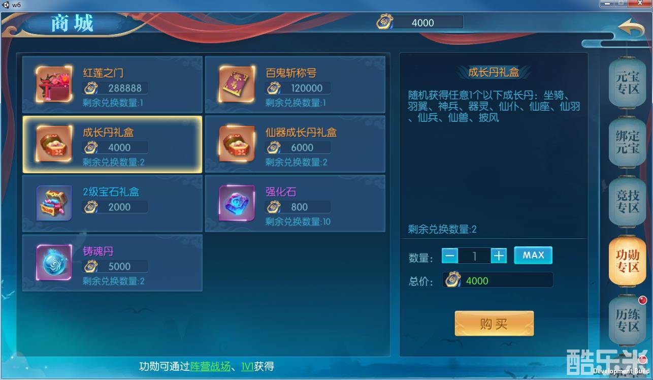 这是龙战苍穹给非R玩家一条快速成长的路径,非R玩家记得在获取绑定元宝之后再进行购买。除了绑定元宝,在游戏中的荣誉、功勋和历练都可以进行道具兑换。