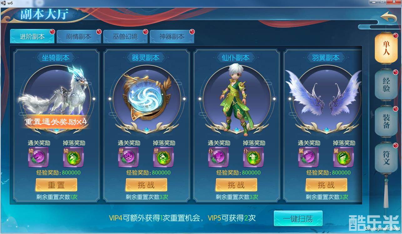 3)副本每天进入次数为1次,可使用20元宝进行副本重置,可重置3次,重置后通关奖励会翻倍;每日24:00将会重置次数。