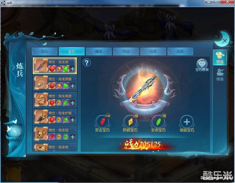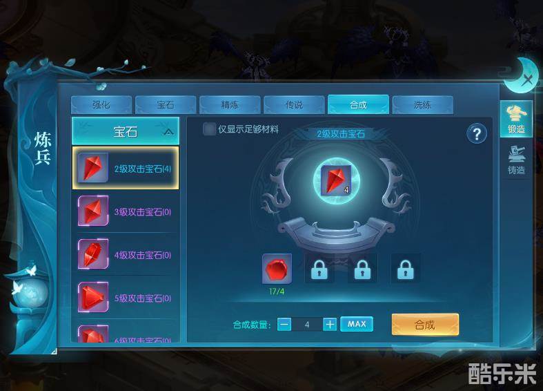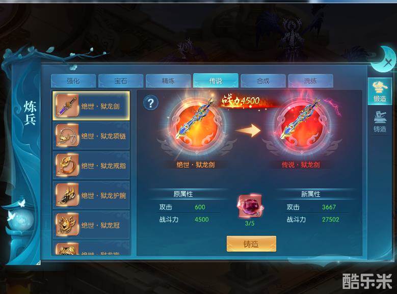 在这里可以进行传说秘卷(各种红装秘卷)和宝石的合成,宝石是用于锻造的镶嵌宝石和提升战斗力,而红装秘卷作用于游戏中的铸造系统(在铸造系统中详细讲解)。