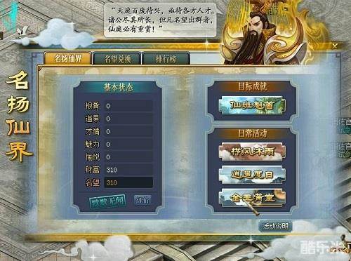 《问道》隆冬节“名扬仙界”的活动内容背景为,玉帝广发诏令,着三界文武之才齐聚仙界,参与仙界事务。完成各类事务可增加财富、根骨、愉悦、道果、才情、魅力等数值,来提高自己的名望,并获得超值奖励。所有公测版等级大于60,经典版等级大于40的道友们都可以通过点击右上角的小图标或者前往活动大使处点击“隆冬节”名扬仙界查看整体活动界面。