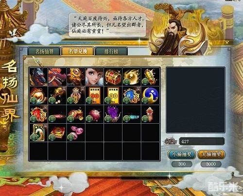 当玩家积累到足够的名望值之后,就可以前往名望兑换页面进行抽奖,玩家可以选择使用300名望进行一次小额抽奖或是使用3000名望进行一次大额抽奖,若玩家选择的是大额抽奖,那么系统就会在抽奖的同时自动排除一些低价值的道具,只从高价值的道具中抽取奖励,提高玩家获得大奖的几率。