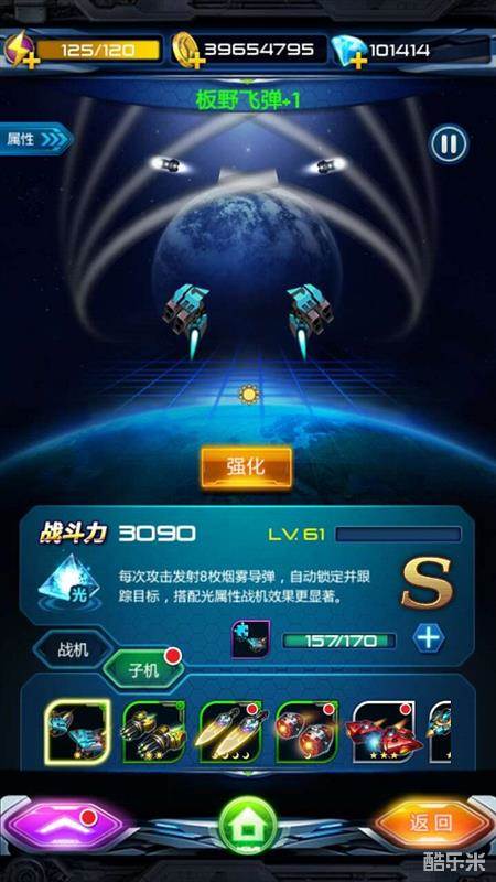 这个时候玩家可以选择提升子机来提升战队的总战力,相对于战机碎片,子机的手机速度快,战力提升速度也快,而且不同的子机在不同的战斗中更能发挥比战机本身更强的威力。下面就让我们看一下S级子机:「板野飞弹」的属性吧。
