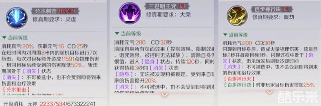 ⚜ 但在打架的时候特别是寰宇就要注意了,消失不光是躲避伤害,最为关键点是让选中你的敌人失去你的目标,楼主推荐的三个消失技能释放顺序是:隐身斩首后输出3秒左右,使用百步神行(注意不是先分水,而是两颗元的百步神行),如果单秒人的时候使用分水容易把伤害分摊给附近的敌人,就无法保证稳杀目标。