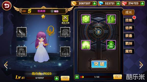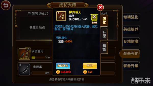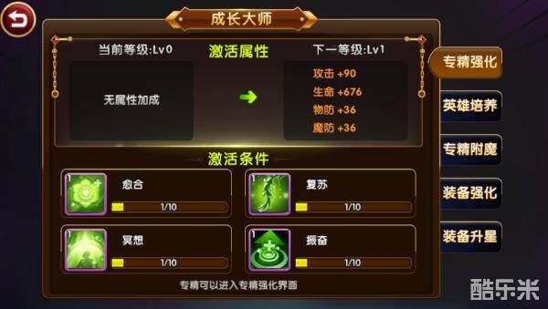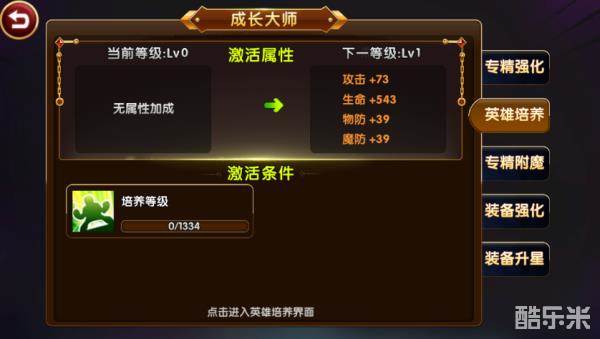 从英雄培养的主界面来看,除了英雄的品质、初始属性无法更改外,其他方面都可以进行培养。屏幕的左侧为成长大师、装备、升级这三处培养。