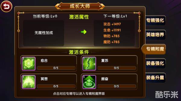 在这里主要是对英雄的基本属性进行培养,专精强化的下方的四个选项分别对应攻击、生命、物防、魔防四项,选择其中一项会进入强化界面,在这里除了可以使用金币对其基本属性进行强化外,还可进行附魔、突破,其中附魔需要使用附魔材料,玩家可通过附魔商店获取材料,附魔可大幅度提升英雄属性及战斗力,而突破则是英雄培养主界面右侧中的突破,下面我们再详细说