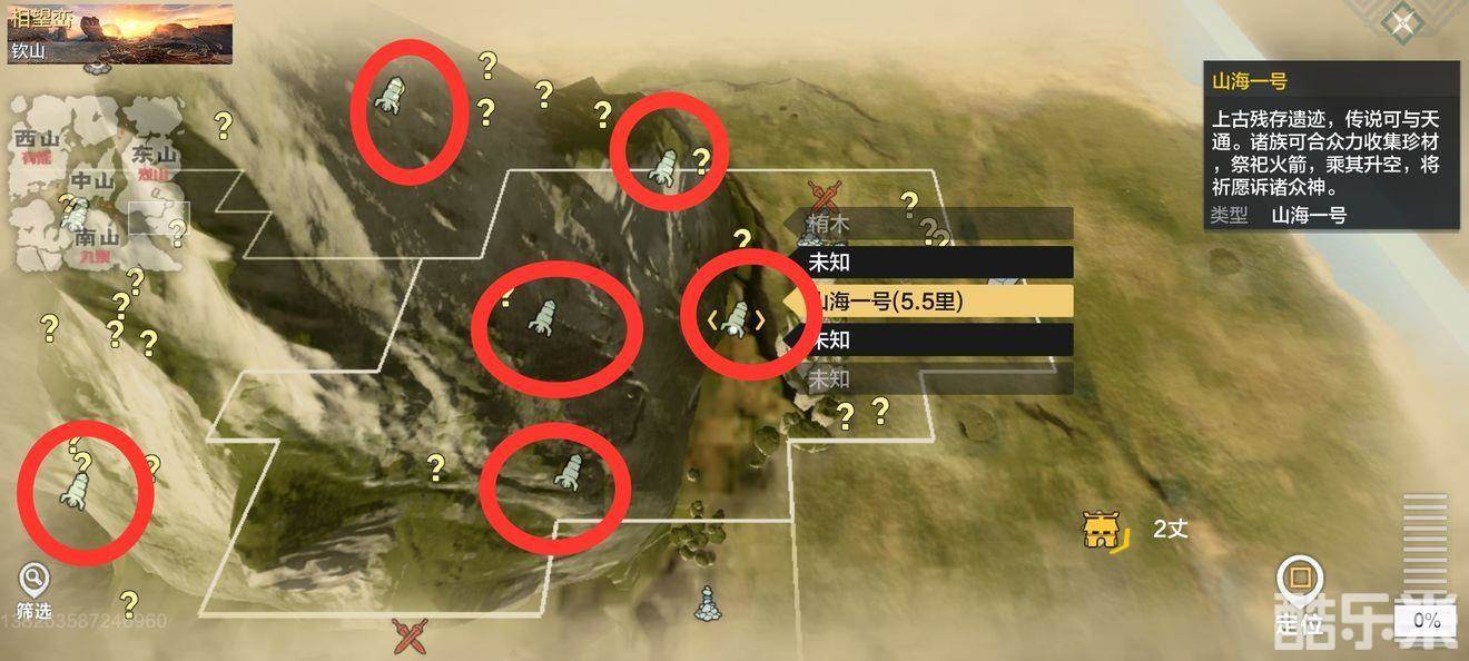 地图上火箭标识被我圈起来的全部都是山海一号标识然后我们就可以定位然后可以骑上坐骑过去