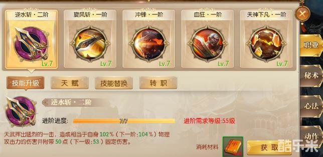 天武前期技能为逆水斩一阶、旋风斩一阶、冲锋一阶、血狂一阶和天神下凡一阶,而这仅仅是前期,后期会有潮声斩、破血斩、霸道之剑、荆棘之甲和不动如山这些技能。前期技能加点看你选择的发展方向,天武这个职业前期发展伤害就好,加点则主加旋风斩、血狂和天神下凡。