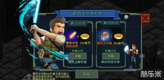 1、光剑礼包:售价6元,性价比极高!建议一定要买,买完游戏体验质变!总之很强!如果你实在不愿意买,打开背包,使用boss掉落的那把电刀,其实体验也不错。