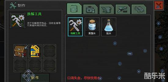 3、制作:制作系统里面可以制作一些吃的、水、工具、装备什么的。前期比较有用的物品还是这个拆卸工具,一些较大的车辆可以靠这玩意拆解,给的资源还不少。