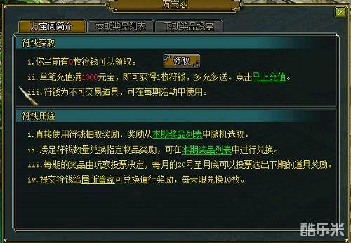 每个月的20号至月末,在当月参与过万宝阁活动的玩家都可以对下一期的可兑换奖励进行投票。投票结束时,系统将根据每个分类下道具的选票数量,将得票数前3名的道具确定为下期的奖品,如果分类下有选票的道具数量不足3种,则系统将随机补足3个道具。