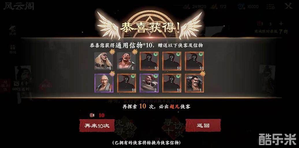 (在侠客贴充裕的情况下,还可以来到风云阁抽取相应侠客。)
