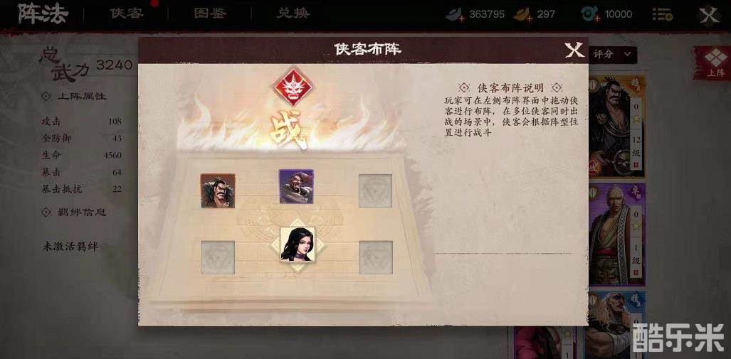 已获得的侠客更是能够加入阵法中,大幅度提升自身战力,对战斗有着非常大的作用。玩家也可以使用道具对侠客进行升级,进一步提升侠客的相关属性。侠客的获取和布阵,是游戏中提升战斗力最为关键的一环!