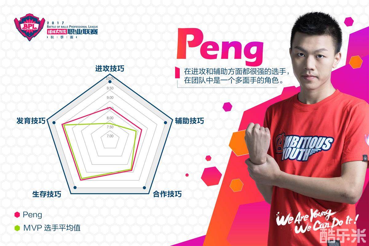 Peng 做为BPL春季赛MVP榜排名第三的选手,实力也是不容小觑。做为AY战队的灵魂人物,Peng的发挥是战队获胜的保障。他常常在逆境中以一己之力带领全队斩获佳绩。生活中是性格沉稳,给人安全感的大哥哥。