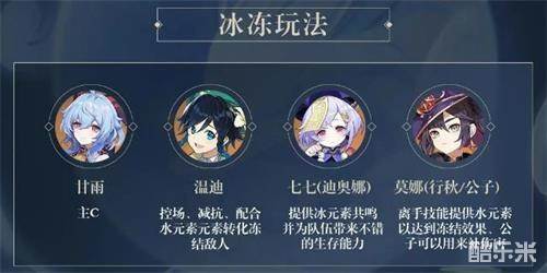 甘雨施放元素爆发后,温迪施放元素爆发将怪物吸附起来进行控制并触发冰元素减抗,通过行秋或莫娜的脱手技能提供水元素附着冻结怪物后,切出甘雨进行持续输出。