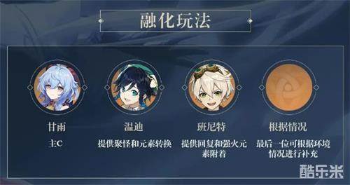 由班尼特起手提供火元素附着(亦可施放元素爆发提升角色攻击力),由温迪开启元素爆发并触发火元素转化,再切换甘雨进行输出。