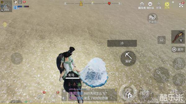 2、冰块需要我们挖掘雪山地图上出现的蓝白色【冰】来获取,属于矿物分类,玩家们只要认准上图样式的冰,靠近后直接点击【采矿】互动键就能够入手冰块了。