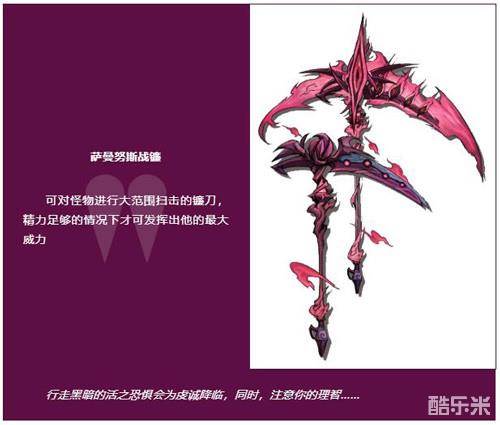 萨曼努斯战镰是一把可对怪物进行大范围扫击的镰刀,在精力足够的情况下,会发挥出他的最大威力。