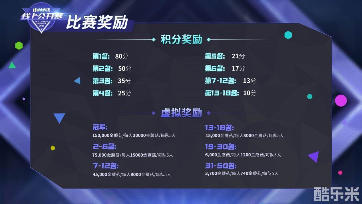 为了鼓励更多的球宝参与到《球球大作战》的电竞赛事中来,整个线上公开赛将于每月都会开启,并一直持续到2021年年底。而在比赛奖励方面,冠军队伍将获得每人30000金蘑菇总计150000金蘑菇的奖励,而排名2~6名、7~12名、13~18名、19~30、31~50名的队伍则将根据队伍人数分别获得75000、45000、15000、6000、3700金蘑菇。此外,每月进入18强的队伍还将根据排名获得数量不等的积分,最终积分较高的队伍将有机会登上塔坦杯精英挑战赛及BGF年终总决赛与职业选手们共秀操作同台竞技。