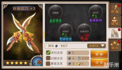 注灵分为灵石注灵、白银注灵和黄金注灵三种,付出越多增加的数值越多。点击注灵之后,如果数值都是增加的,再点击替换,这样增加的数值就叠加在原来的数值之上了,这样战斗力就可以提高了。