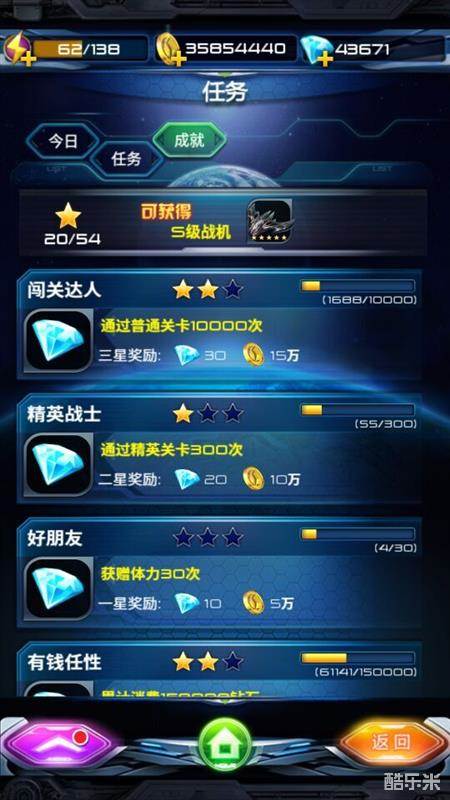 【任务系统】任务系统中包括今日、任务和成就。每天完成今日的“今日”活动,不仅可以获得金币还可以获得飞机碎片哟。任务和成就也多种多样,只要完成了就送金币、送钻石啦。