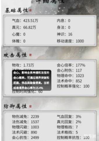 我们可以通过境界突破与武器、饰品类装备和养成来提升该属性。在属性界面中点击会心图标,我们便能清晰的看到自己当前的标准境界会心率。