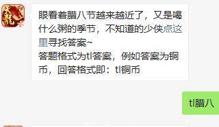 眼看着腊八节越来越近了又是喝什么粥的季节这个是天龙八部手游1月15日中的微信公众号的问题,我们想要知道答案,自然是少不了对于国家传统节日习俗的一些了解,下面小编带来的就是眼看着腊八节越来越近了又是喝什么粥的季节的答案分享,看看在节日中我们需要注意一些什么样的事情吧,下面就是具体的介绍了。