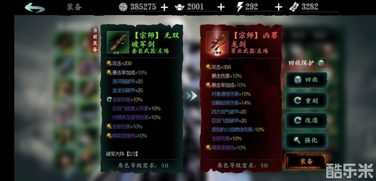 绿装吞噬相同绿装升级宗师的时候,记得一定要把吞噬的装备词条的一条属性给改造满了(磁条变成黄色字体),你会发现吞噬到宗师只需要4到5件的相同装备,而不是十几件。
