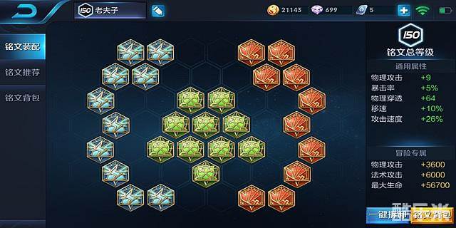 这套铭文主要是追求其攻击速度和物理穿透,攻击速度使老夫子被动可以更快的打出来,物理穿透可以对坦克和战士造成更大的伤害。能够在前期就打出老夫子的被动优势。