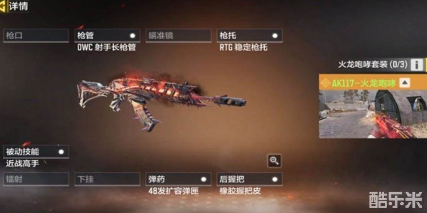 2、AK117火龙咆哮自带OWC射手长枪管增加了射程,RTG稳定枪托, 近战高手,48发扩容弹匣,橡胶握把皮,这五个配件。