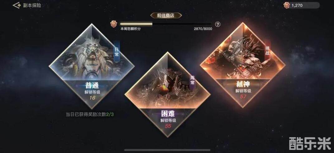 每天的PVE活动玩家们必须刷三次副本探险,其中分为普通、困难、弑神三种不同的难度,普通副本每天共享三次奖励,玩家们一定要刷能够入手很多的经验值,当然还能得到不少的装备,要是你奖励次数用光了也没关系。