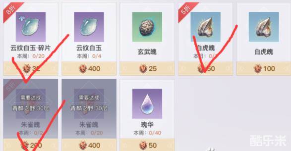 其中最为重要的是云纹白玉和朱雀魂,如果是白嫖玩家的话建议把这两个直接拉满,之后打折的白虎魂也是可以兑换的。