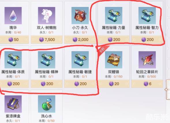 首先优先把图中圈出的属性秘籍全部兑换了,每个属性可以使用7次,等级提升之后还能使用更多。