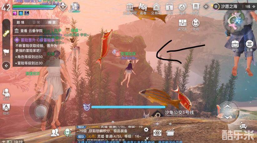 首先玩家们在接取任务之后去汐愿之海、珊瑚海,这个坐标是没法寻路的,大家看图就知道位置在哪里了。有一个很大的人鱼雕像记得拍照哦。玩家们往下面游泳就会看到蓝色的水母,靠近之后便可以对话。