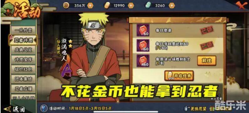 接下来再说一些这个活动的细节,首先就是你选择忍者以后就会呈现出每日任务和每周任务,这个并不是关键,关键是下面还有一个200金币开启任务的选项。第一次上线这个活动的时候就有不少玩家以为不用金币没办法拿到整卡,所以就直接消耗金币开启了,但其实,只要你仔细看活动的说明和计算活动的周期,基本上就能够明白这个金币完全不需要花。