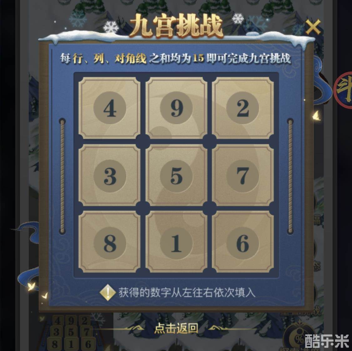 九宫挑战的规则为:采集数字从左往右依次填入,并且保证最后填入九宫数字每行、每列、对角线之和均为15,即可完成九宫挑战。
