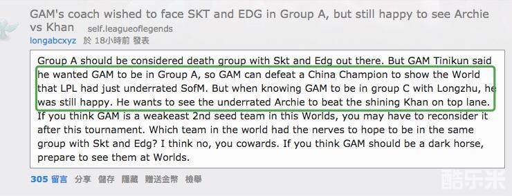 据reddit上透露的消息,越南GAM战队教练Tinikun在看到小组抽签结果时表示:想进入A组并打败中国的冠军队伍EDG,并以此向世界证明LPL低估了Sofm。但当他得知GAM与LZ一同分到了B组(原帖错误写成了C组)依旧很开心,想看到同样被低估的Archie(GAM上单)在上路打败耀眼的新星Khan