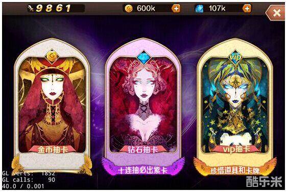 金币抽卡,可随机获得白、绿、蓝卡,并有机会获得紫卡碎片。