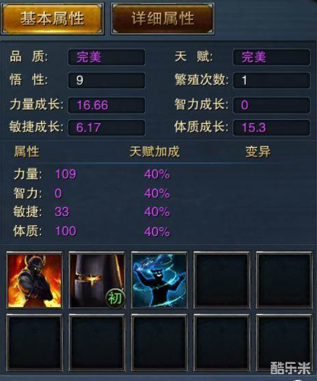 宠物具有品质和天赋两种基础属性,都分为白(普通)绿(优秀)蓝(精良)紫(完美)橙(传说)五种颜色。品质决定着宠物的基础属性,先天羸弱的弱小宠物肯定不如健壮的新生儿了!天赋则决定着宠物成长属性,宠物每升一级根据天赋级别所增加的属性幅度是不一样的,这类便是所谓的潜力股!
