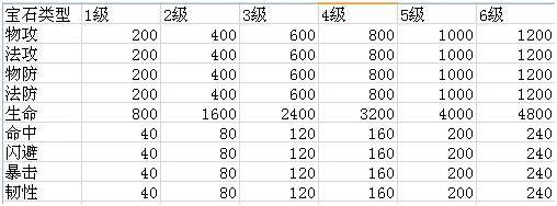 综上所述这四样宝石 后三样我认为是必须要具备的,当然了有些玩家有自己的想法。可以自己决定用什么宝石。我这只是个参考。至于攻击宝石,攻击类武将一定要有,辅助类武将因为加血的数值跟法强也是有关的,所以最好也用,防御型的武将可以根据需求自行决定。下图为每级宝石的属性。