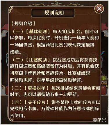 每次比赛时,分别进行一场单人赛和团队赛,根据两场比赛的表现确定最终成绩。获胜者将随机获得技能升级道具和高级装备,并有机会获得高级卡牌碎片或万能碎片奖励。