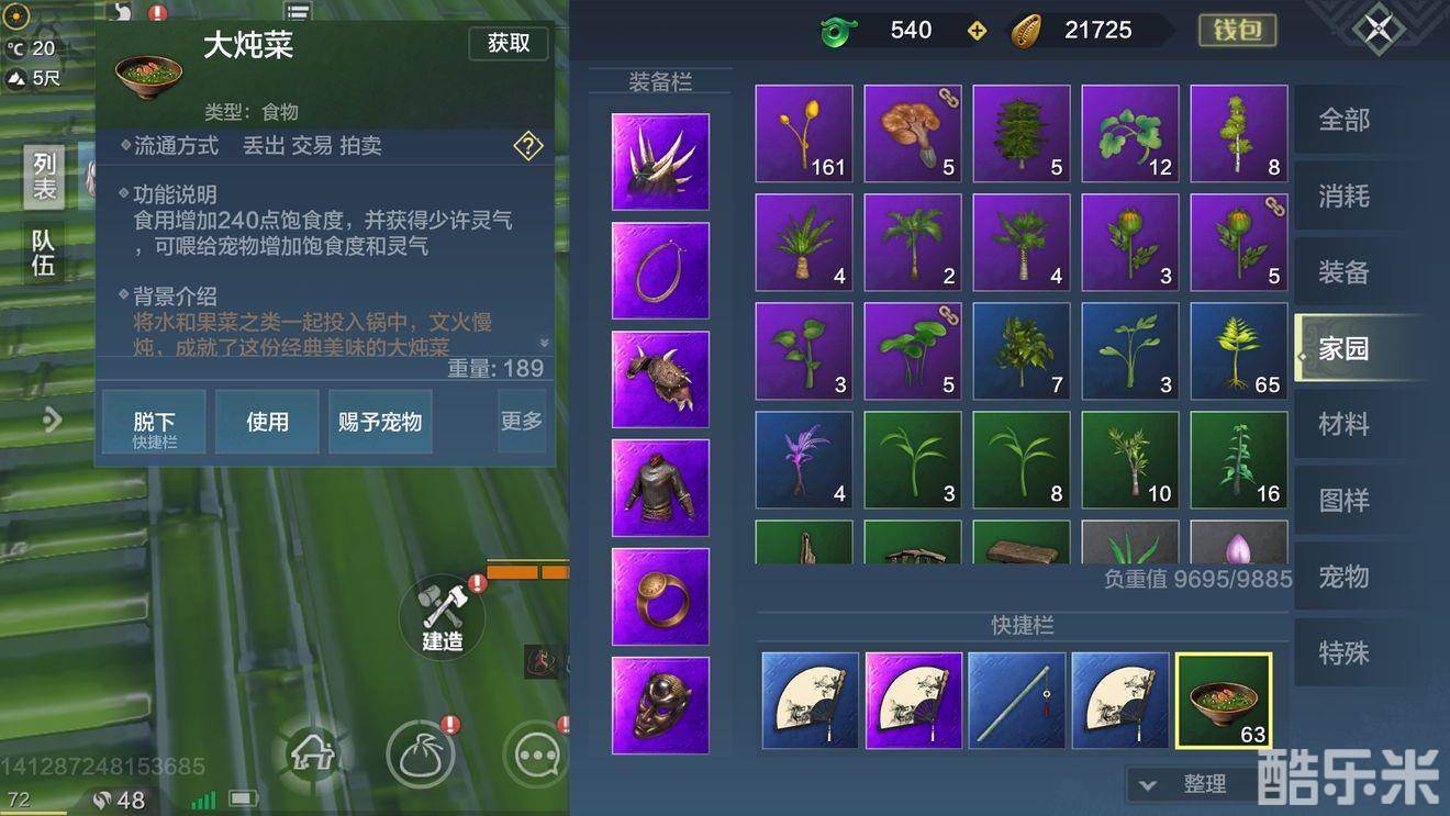 前期采药主要是莽草,可以合成蓝色药品,但是这个东西实在是不太值钱,大家很快就过度到需要使用橙色的药品。而且采药的等级直接关乎树苗和寄生草的产量,所以我推荐前期采棪果(好像叫这个)。它可以提供大量露水以及果子,然后去蹭2级灶台,制作菜汤,恢复240饱食度只需要5秒。而且可以骑上坐骑边跑边吃。