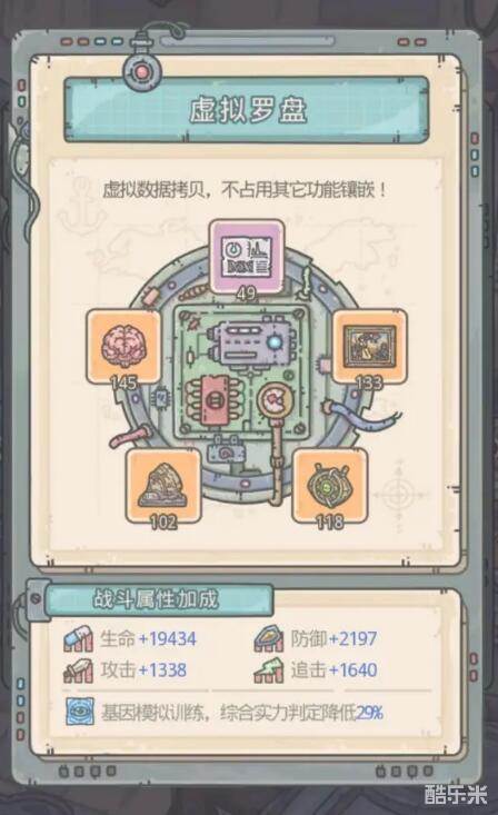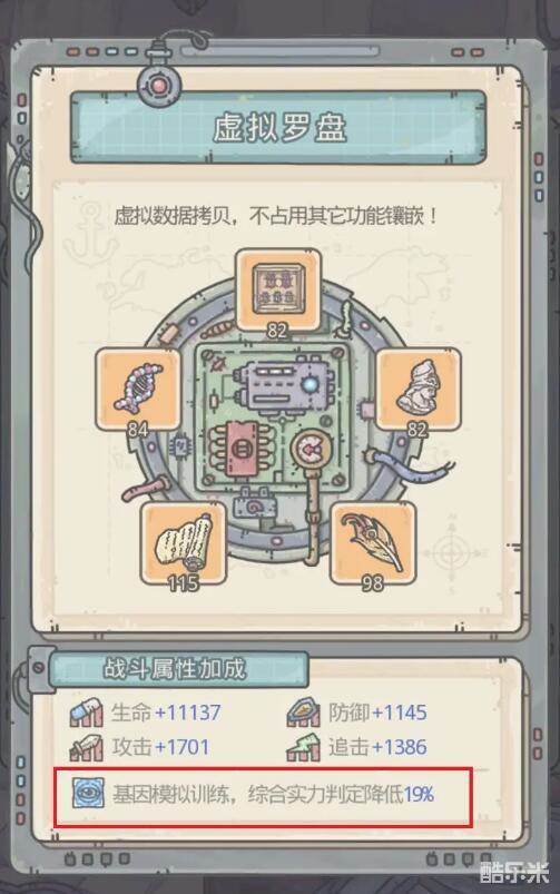 在基因模拟战斗的虚拟罗盘中,我们可以在最下方看到这样一行小字:基因模拟训练,综合实力判定降低19%,也就是说如果你的超人追击条件原本是1900W的,经过虚拟罗盘的效果后可能会变成1539W,是不是一下子降低了好多?这个综合实力判定的效果还跟虚拟罗盘上的贵重品有关。