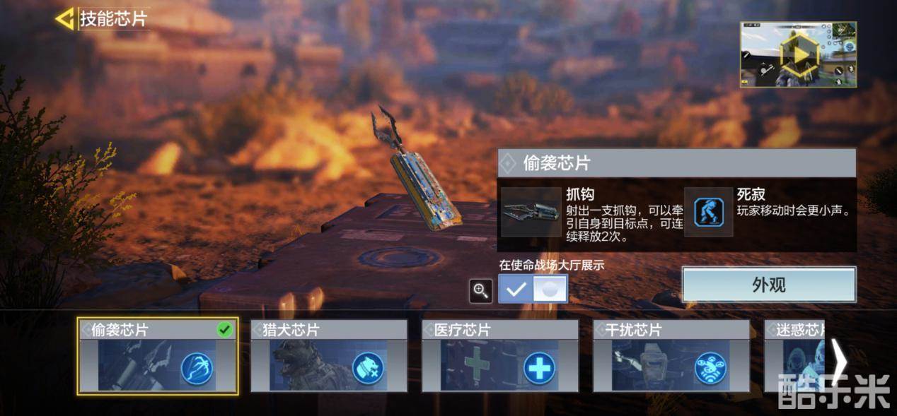偷袭芯片分为主动和被动两个效果。主动效果是射出一个抓钩,可以牵引我们到达目标点,未升级、强化时,一局最多可以储存两次,升级强化后,我们最多可以储存三次。被动效果是拥有死寂效果,死寂效果下玩家移动时脚步声会变小,可以尽可能隐藏自己的身形,增加我们的偷袭成功几率。