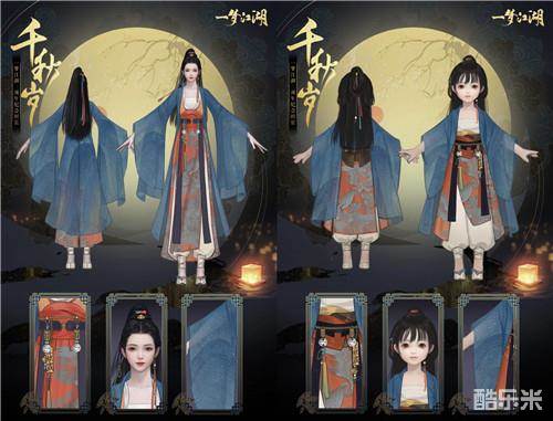 穿着“千秋岁”时装的成女高高束起了长发,发丝自然垂下,清爽又干净利落的衣身裁剪既能衬托出成女修长的腰身,大方利落的气质中又透露着些许的书卷气息。少女款式的“千秋岁”则挽起了秀气玲珑的发髻,齐眉的轻薄空气刘海,显露出小女侠们俏皮灵巧的气质。