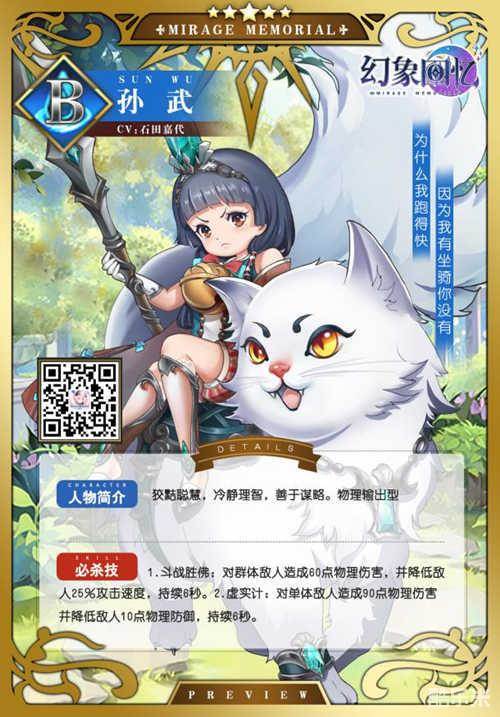 在《幻象回忆》这款游戏中,孙武虽是一位B阶从者,但是她可是唯一一位拥有萌款坐骑的从者哦~在战斗中,她的物理输出能力也是杠杠的!此外,作为“兵圣”,孙武还拥有聪明的大脑,冷静理智,是团队中的睿智担当!