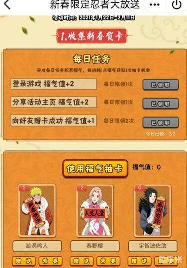 活动内容:学员可由此前往活动小程序,完成每日任务累积福气值可抽取不同种类的贺卡,集齐一套普通贺卡可在小程序内兑换1个普通灯笼道具,获得奈良鹿丸[新春限定]贺卡可在小程序内兑换1个特殊灯笼道具,灯笼道具将以邮件方式发送至游戏内。