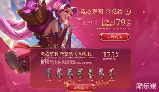 为满足不同玩家的需求,除皮肤本体外,本次上架的两款情人节限定皮肤还将以“炫彩礼包”的形式限时出售,其中“觅心萝莉 金克丝”炫彩礼包限时特惠售价为175.21Q币,礼包包含皮肤本体及7款皮肤炫彩,在2月28日之前,“是心动啊”炫彩将仅随礼包以0.01Q币价格出售。此外,“准你表白”炫彩则将仅随礼包出售。