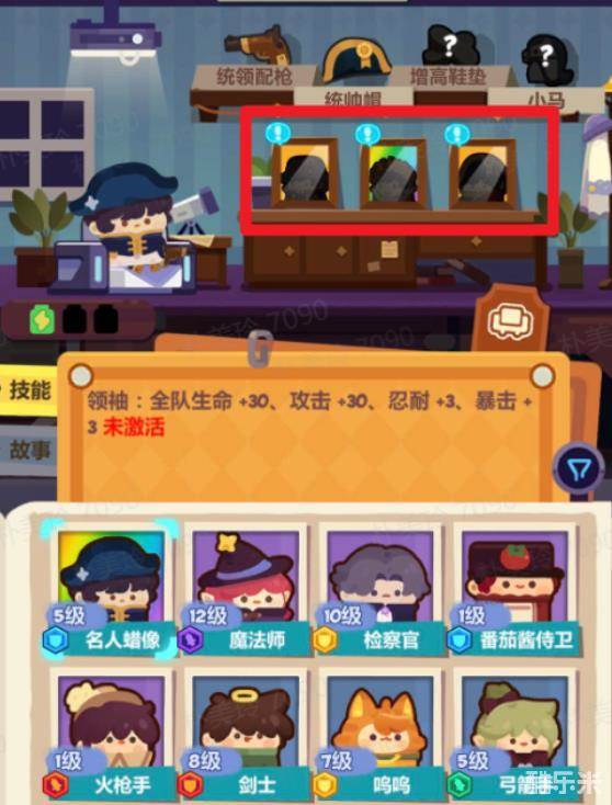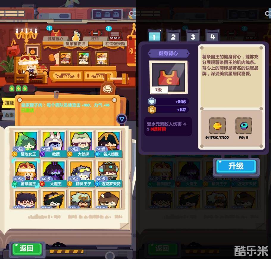 角色的房间里展示着他们的专属装备,角色稀有度越高,装备数量越多,比如薯条国王拥有4件装备。装备可通过使用金币和零件来强化,零件则通过不夜城奖池、完成订单等方式获得。强化后的装备可以为角色带来一定的属性加成。