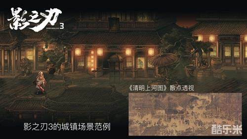 为了表达《影之刃3》独特的暗黑武侠世界观,制作组从中国传统国画技法中寻得灵感,将极富中国特色的国风元素融入游戏中,如:参考《清明上河图》散点透视的场景设计,参考《千里江山图》的国画矿物颜料配色。在体现出影境江湖独有的诡异、冷峻风格的同时,也将展现出中国武侠独特的美感。
