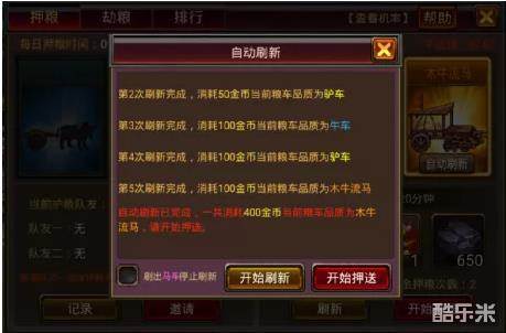押送军粮增加自动刷新功能,自动刷新可以连续进行自动刷新直到刷出马车或者木牛流马才停止刷新。